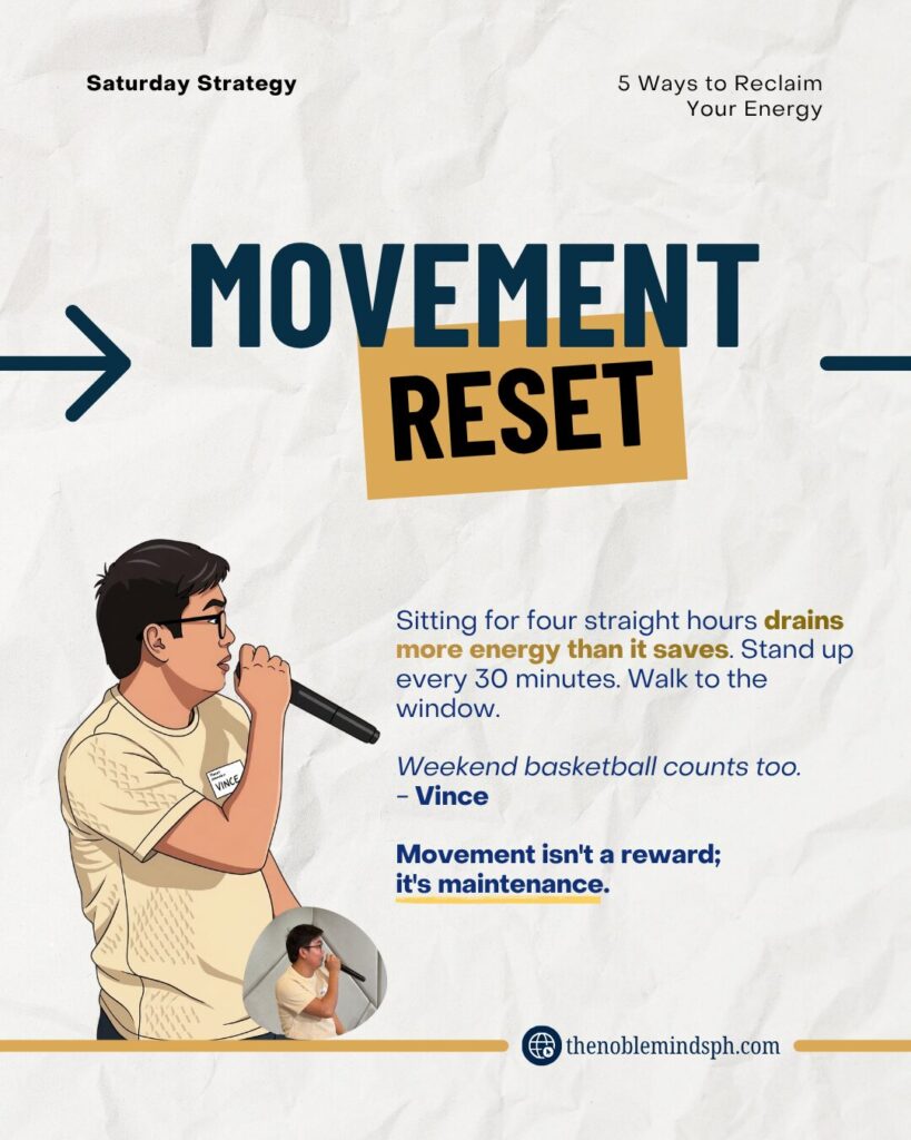 Physical movement helps reduce stress and restore energy. Sitting for long periods can leave you feeling sluggish and mentally heavy, even if you have not done anything physically demanding.